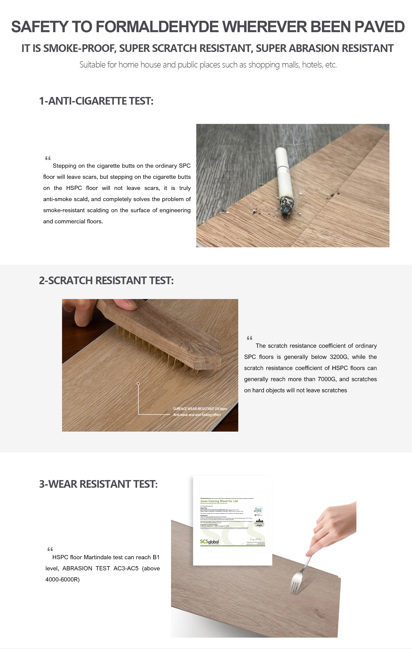 Super wear-resistant and scratch-resistant, crystal steel polymer HSPC floor is a new type of environmentally friendly floor based on high-tech development. It has the advantages of anti-smoke, super scratch resistance, super wear resistance, zero formaldehyde, no heavy metals, parabens, methanol and other harmful substances.